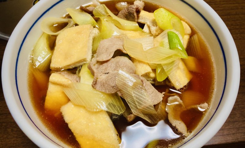 基本的には豚バラ肉と長ネギ、油揚げがつけ汁に入っていて、甘辛い味が特徴です。