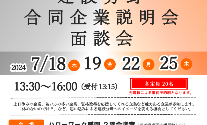2024.06.26 2024.06.28 建設分野 合同企業説明会・面談会 お知らせ Post Share RSS feedly 7/18.7/19.7/22.7/25の4日間、「建設分野の合同企業説明会・面談会」が開催されます。弊社は7/19(金)に参加を予定しておりますので参加ご希望の方はハローワーク盛岡までお問い合せ・お申込みをお願いいたします。 パンフレット(PDF) 建設分野合同企業説明会・面談会参加申込フォーム Post Share RSS feedly 石川選手、蒔苗選手が来てくれました!! 前の記事